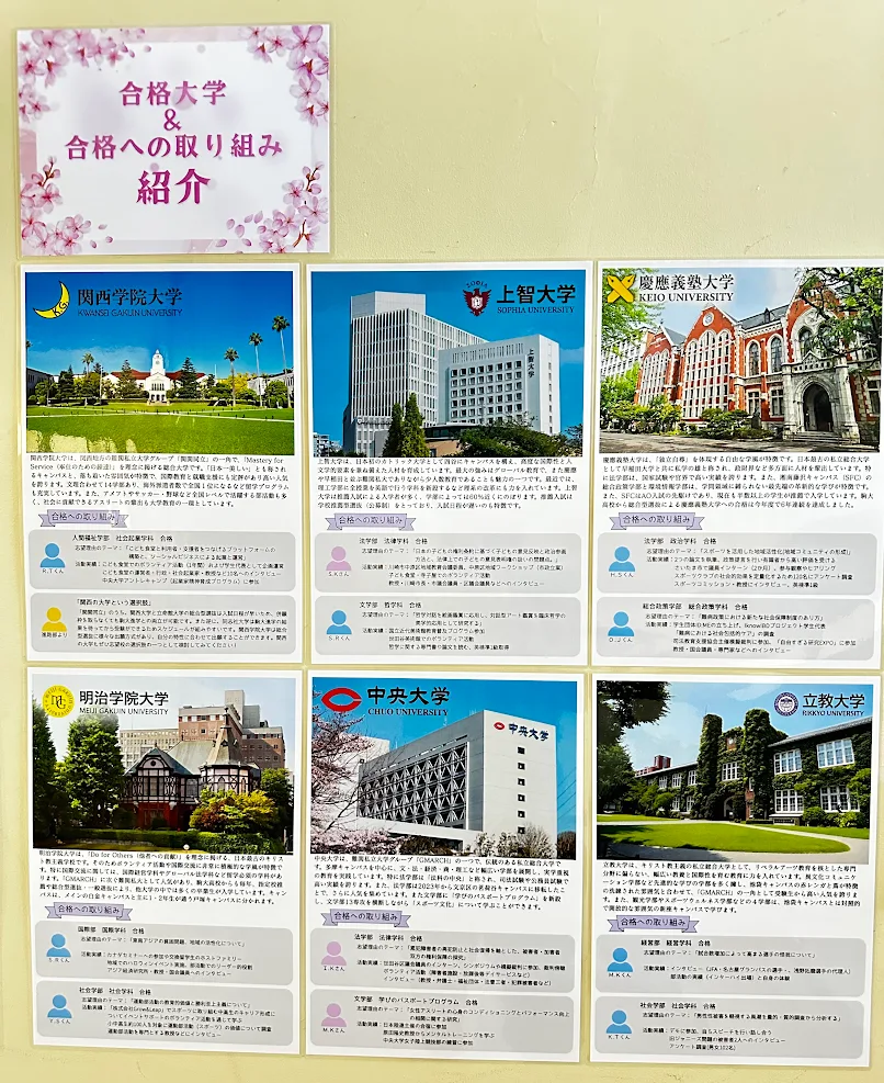 早稲田大学/慶應義塾大学/上智大学/青山学院大学/立教大学/中央大学/関西学院大学/立命館大学/明治学院大学/國學院大學/武蔵大学/昭和女子大学/東京女子大学/日本女子大学/東京医療保健大学/聖路加国際大学/東京女子医科大学/昭和医科大学/順天堂大学/日本大学 ほか